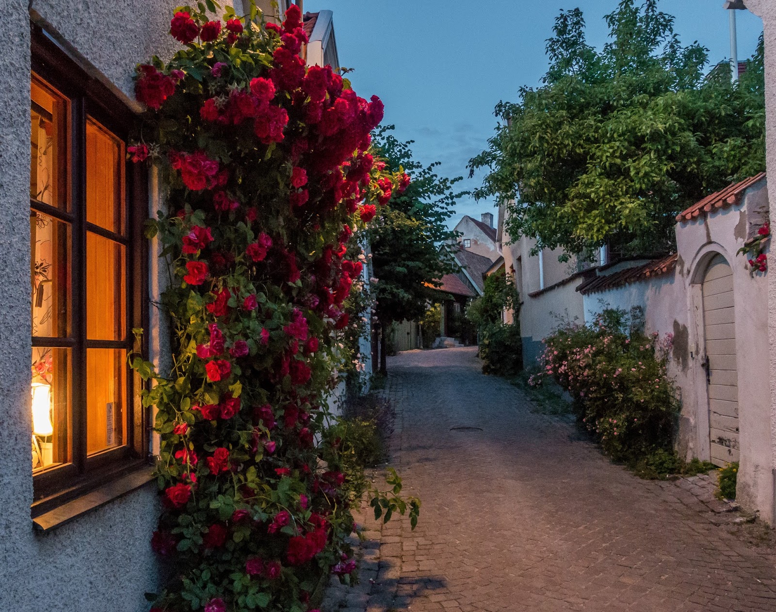 I juli blommar rosorna som mest i gränderna i Visby. Innanför ringmuren ligger husen tätt och har knappt några trädgårdar. Vid fasaderna längs gatorna finns det lite plats att sätta växter och eftersom Gotland har växtzon 1 så trivs rosor alldeles ypperligt. Och Visby är ju rosornas (och ruinernas) stad.